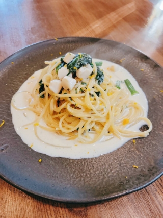 小柱とちぢみほうれん草のクリームソース柚子風味です。