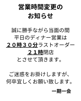 平日ディナーのお時間の営業時間を諸事情により少し短縮させて頂きます🙇♂️