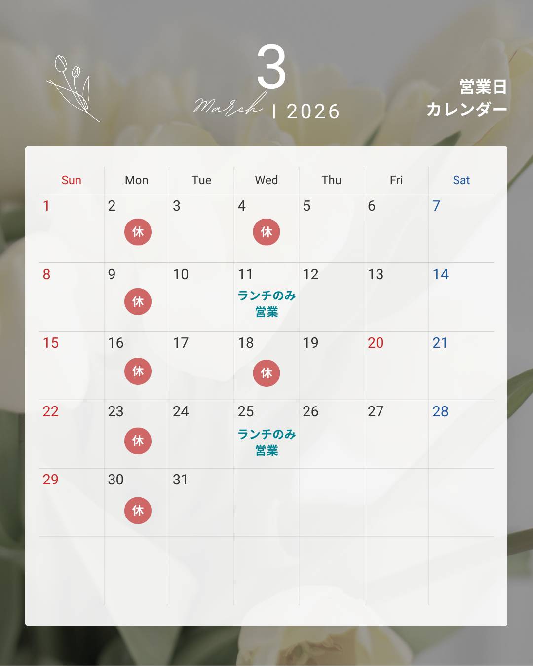 3月営業日&定休日のご案内🌸