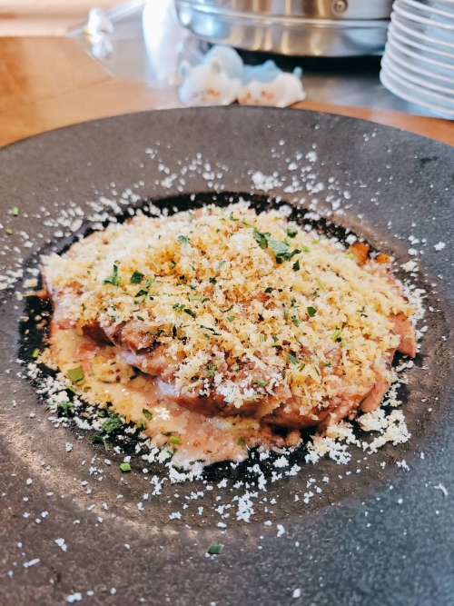 もち豚の香草パン粉焼き マッシュルームのクリームソース