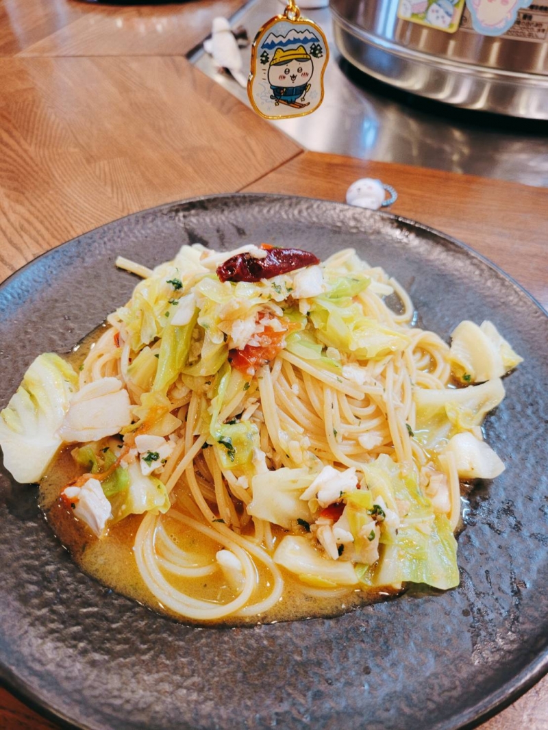 鱈とキャベツ、トマトのペペロンチーノ